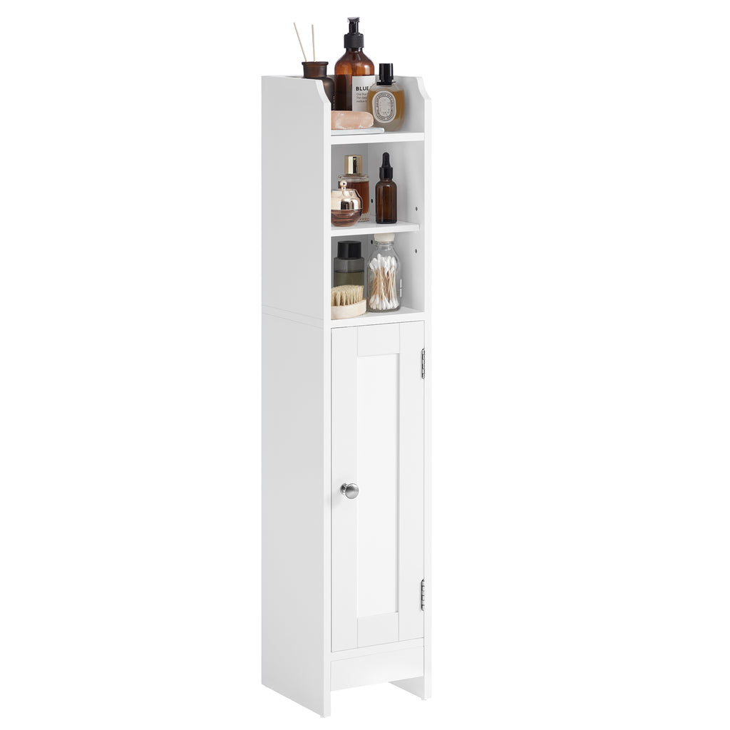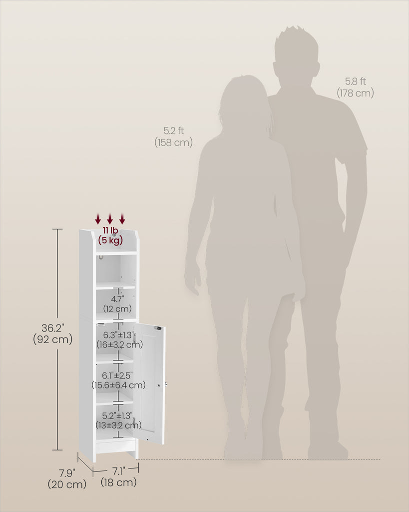 Color: Cloud White Material: MDF (Medium Density Fiberboard) Overall Product Size: 7.9"D x 7.1"W x 36.2"H (20 x 18 x 92 cm) Product Weight: 12.3 lb (5.6 kg) Max. Static Load Capacity of Each Adjustable Shelf: 11 lb (5 kg) Package Contents: 1 x Slim Bathroom Storage Cabinet 1 x Accessory Kit 1 x Anti-Tip Kit 1 x Instructions