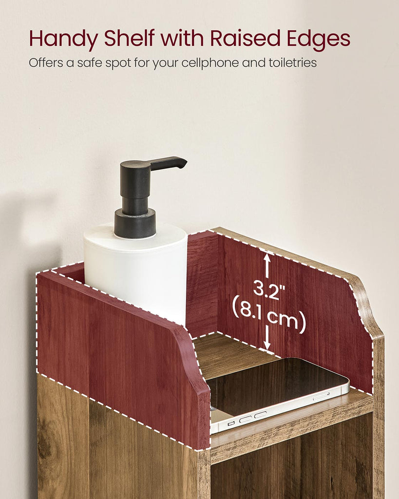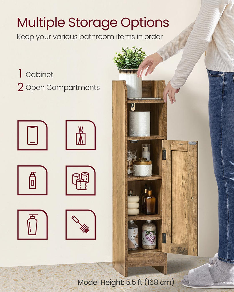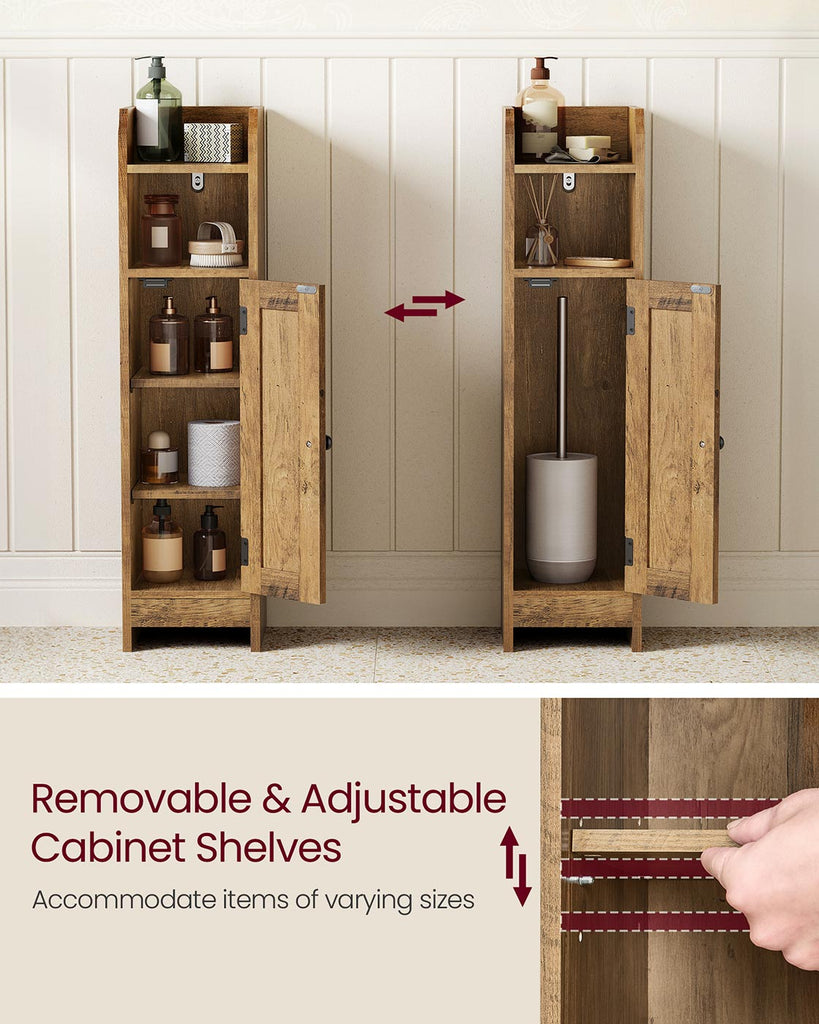 Color: Honey Brown Material: MDF (Medium Density Fiberboard) Overall Product Size: 7.9"D x 7.1"W x 31.5"H (20 x 18 x 80 cm) Product Weight: 10.6 lb (4.8 kg) Max. Static Load Capacity of Each Adjustable Shelf: 5 lb (2.2 kg) Package Contents: 1 x Slim Bathroom Storage Cabinet 1 x Accessory Kit 1 x Anti-Tip Kit 1 x Instructions