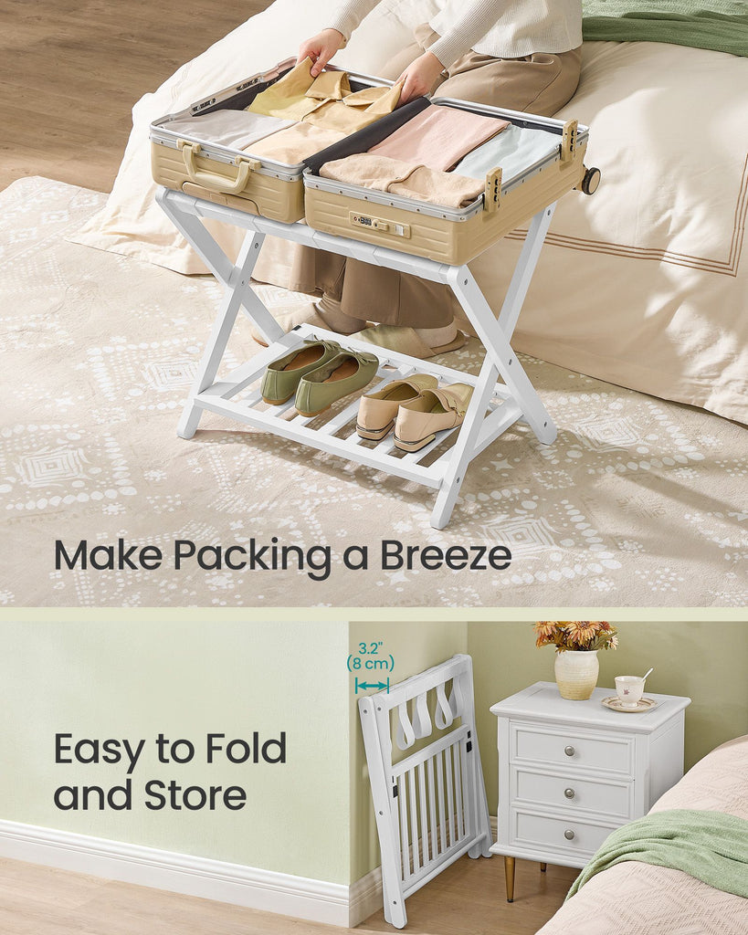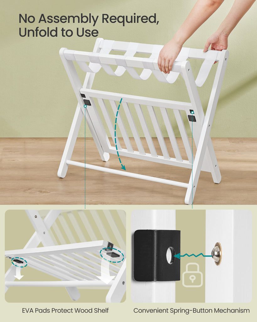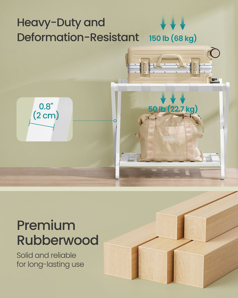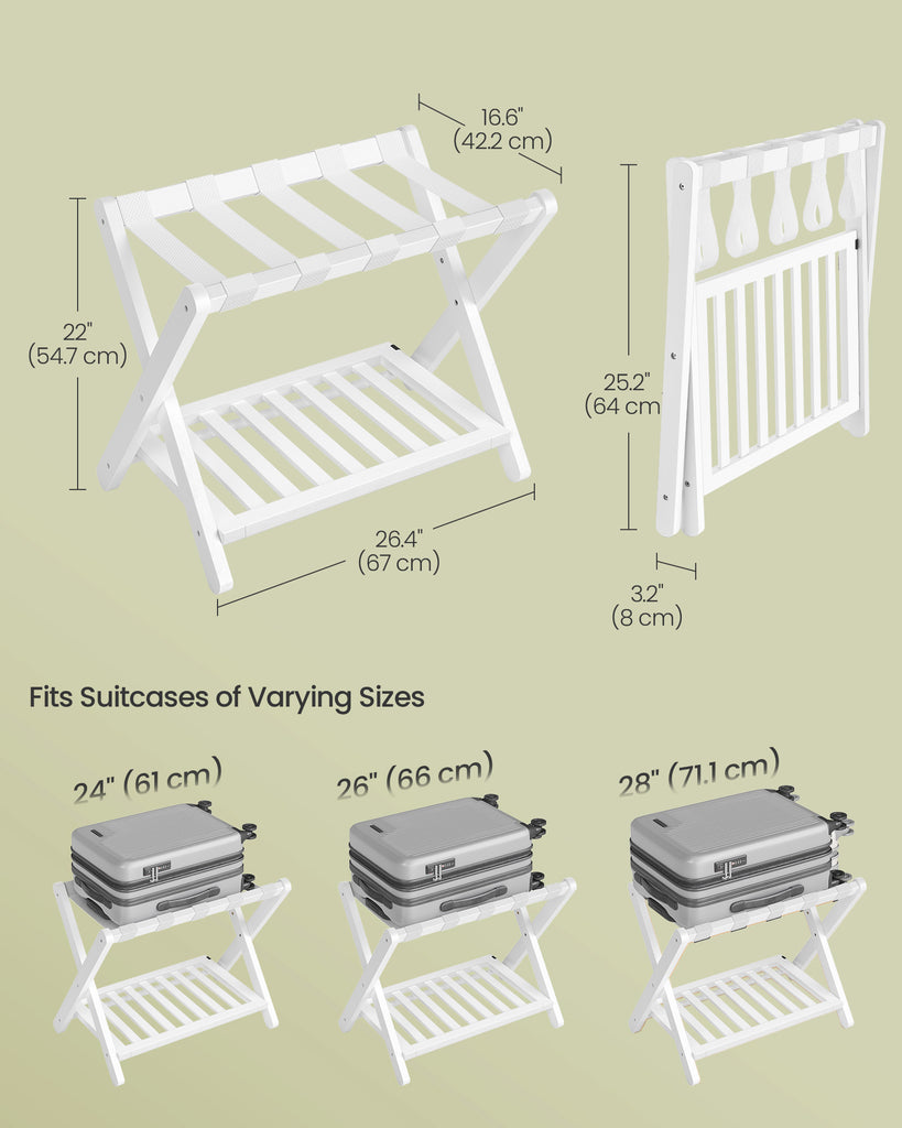 Color: Cloud White Material: Rubberwood, Nylon Straps Overall Size: 26.4"L x 16.6"W x 22"H (67 x 42.2 x 54.7 cm) Folded Size: 26.4"L x 3.2"W x 24.4"H (67 x 8 x 64 cm) Product Weight per Rack: 7.9 lb (3.6 kg) Max. Static Load Capacity of the Top: 150 lb (68 kg) Max. Static Load Capacity of the Lower Shelf: 50 lb (22.7 kg) Max. Total Static Load Capacity per Rack: 200 lb (90.7 kg) Package Contents: 2 x Luggage Rack