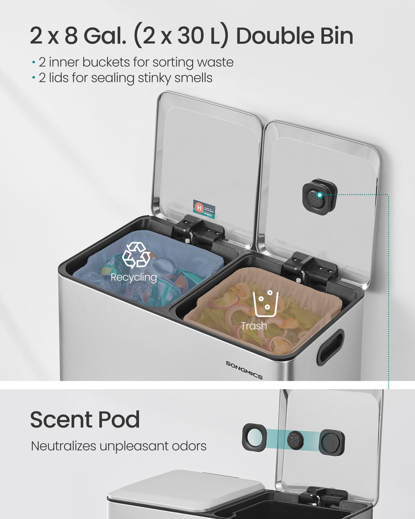 Trash Can, 2 x 8 Gallon (2 x 30 L) Double Garbage Can with Soft-Close Lids