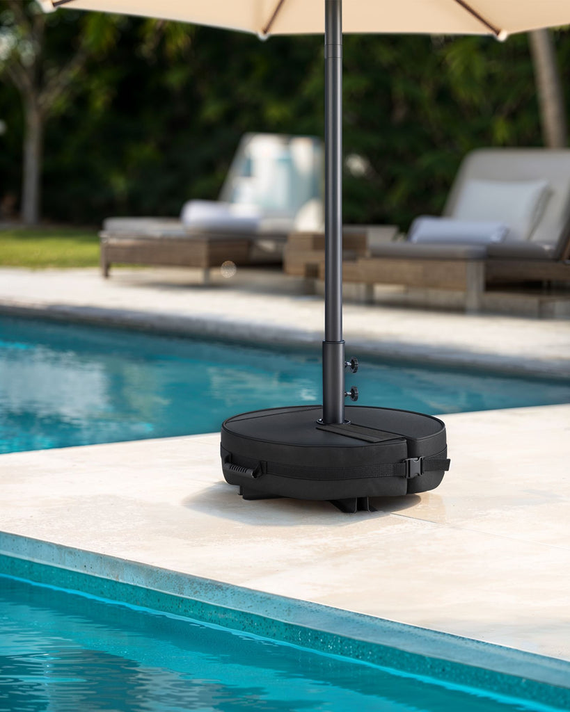 The highlights of the Umbrella Stand at a Glance: For Various Umbrellas: Accommodates different pole diameters thanks to the included 3 reducer rings. Not suitable for cantilever umbrellas. Stable: Ensures stability with a strong construction of the cross base, pole holder, and a sandbag that can be filled up to 66 lb. Robust and Stable: Constructed with quality steel and 600D Oxford fabric. Adjustable Strap: Allows for size adjustment of the bag according to the amount of sand. Large Opening: Facilitates easy filling of the sand, saving time and effort. Tight Zipper Closure: Prevents sand leakage. Side Handle: Enables easy transport of the bag. Specifications: Color: Black Material: Steel, 600D Oxford Fabric Product Size: 21.5"L x 21.5"W x 15.5"H (55 x 55 x 40 cm) Product Weight: 5 lb (2.3 kg) Package Contents: 1 x Umbrella Base 1 x Accessory Kit 1 x Instructions Note: This umbrella stand is not suitable for cantilever umbrellas.